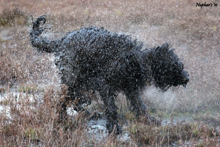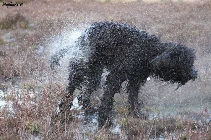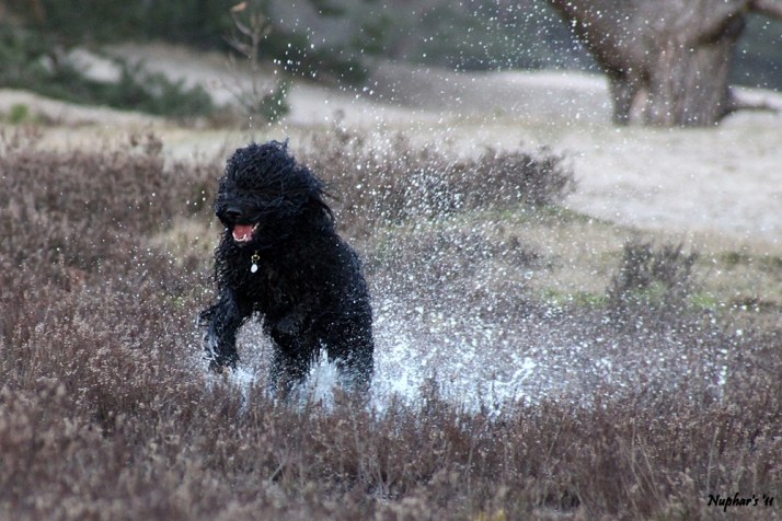 Nu er zoveel regen is gevallen, is eigenlijk elke wandeling een natte wandeling maar de Soesterduinen zijn momenteel een Alba-Paradijs. Als het veel regent, ontstaan daar een soort meertjes waarin je heerlijk kan plenzen. Niet grappigers dan heel hard rondjes rennen door de heidestruikjes waar een laag water tussen staat.