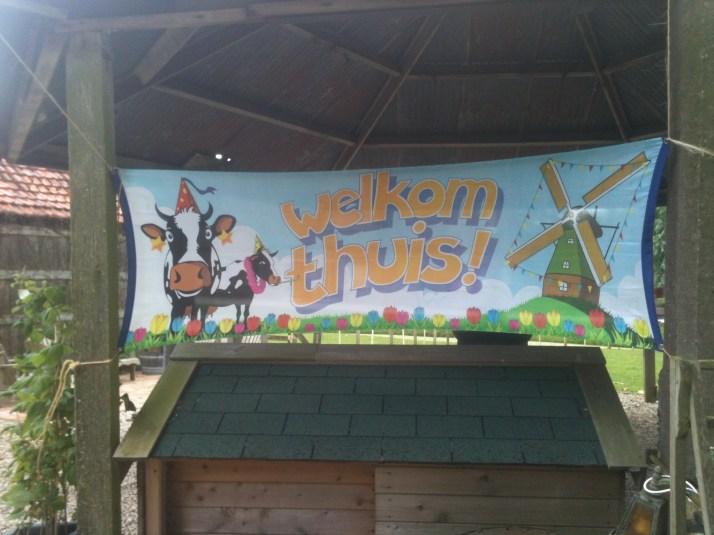 Thibault woont nu op een prachtige boerderij met kippen, paarden, schapen, konijnen, een kat en zijn nieuwe familie. Hij werd verwelkomd met een spandoek! Na een rustig ritje in de auto heeft hij op z’n gemakje het huis verkend, daarna het erf bekeken en tegen de tijd dat wij weggingen was hij diep in dromenland.