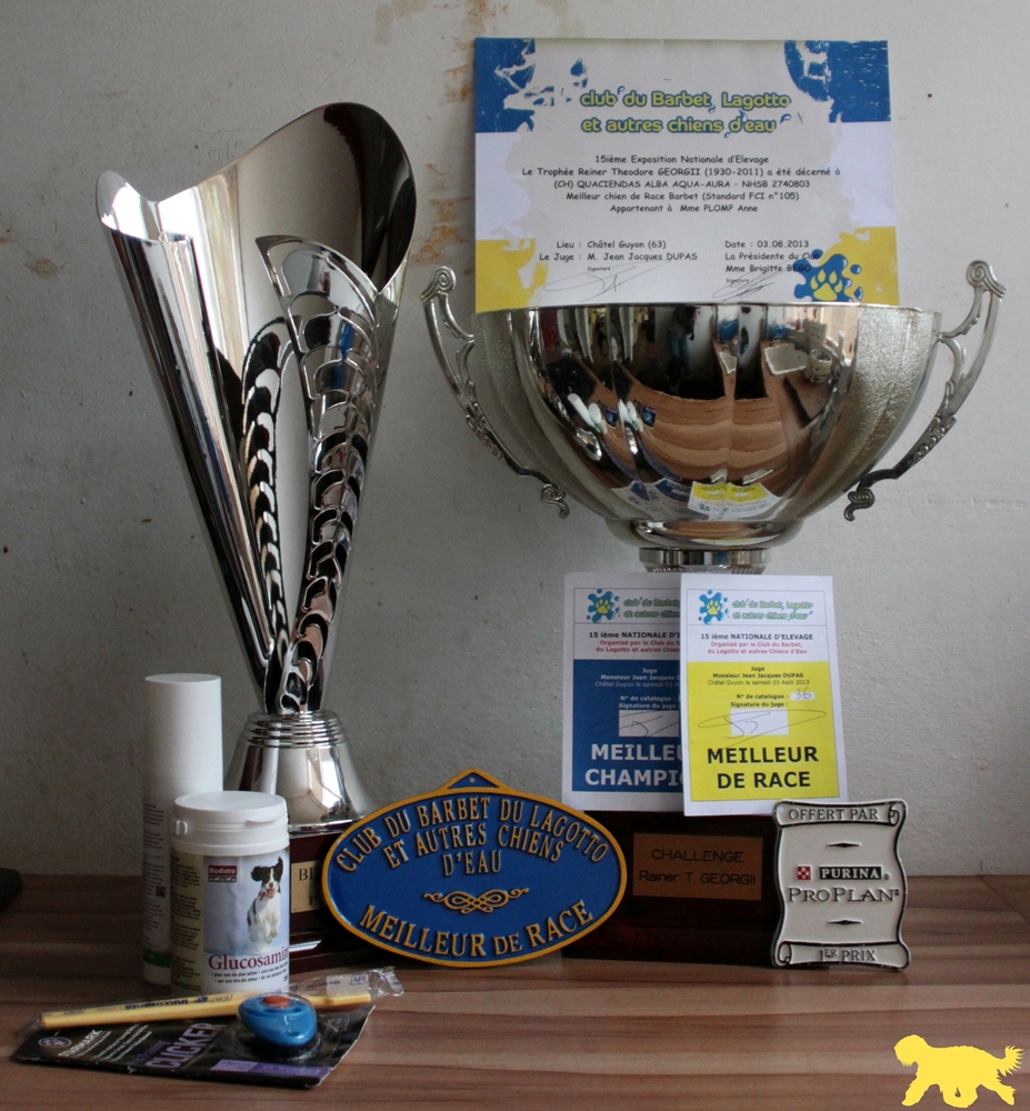 De beker die de keurmeester vast heeft, is de ‘Georgii Challenge Trofee’, een wisselbeker die sinds het overlijden van Georgii beschikbaar gesteld wordt voor de Best Of Breed van de Barbets op de Nationale d’Elevage. Georgii is de fokker van Alba’s oma Udine.