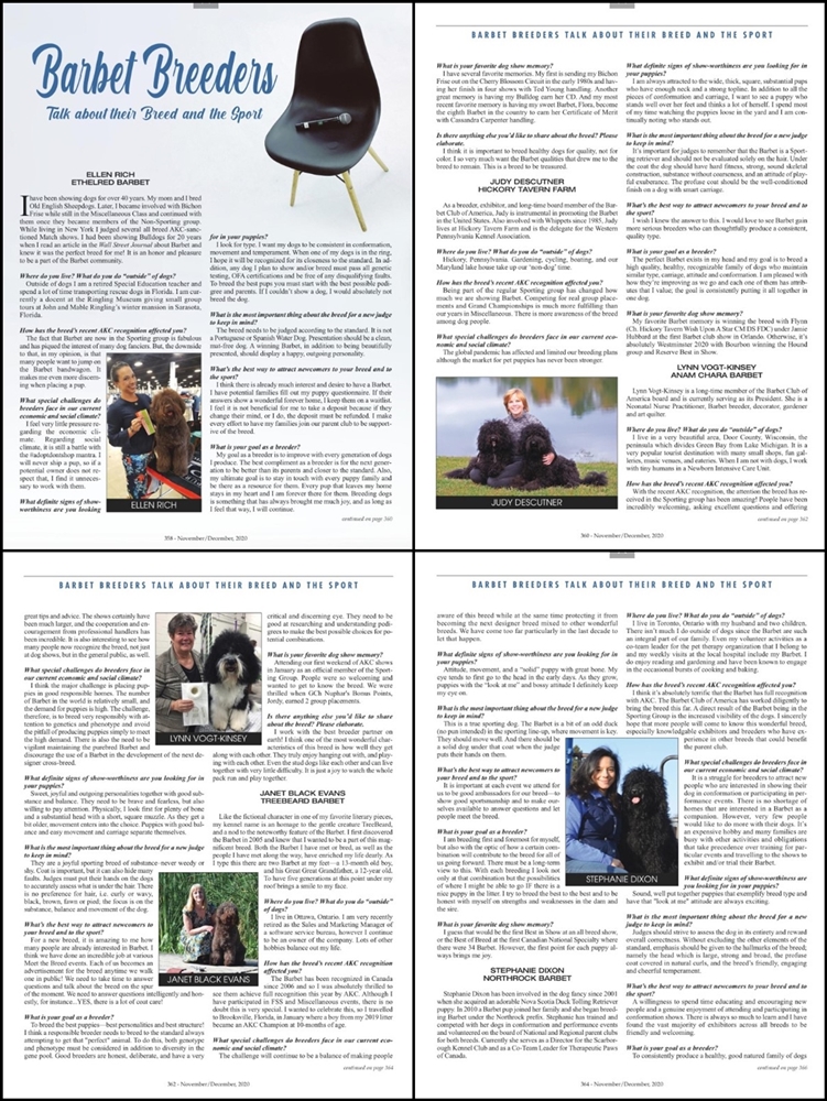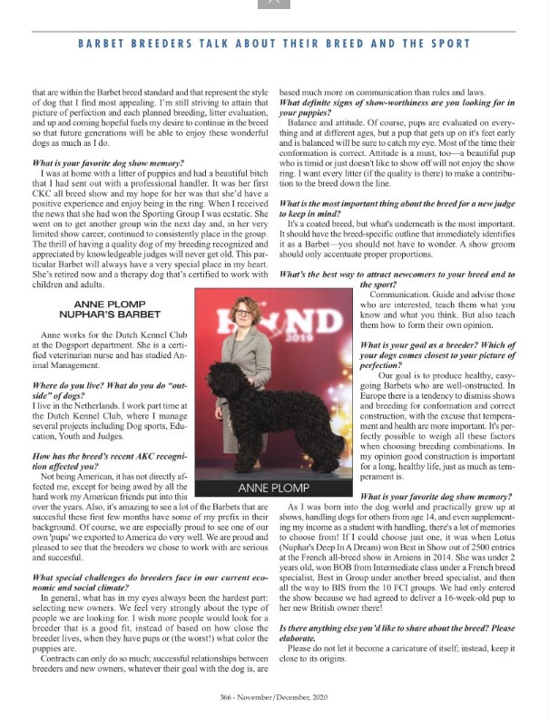 Eerder dit jaar was me gevraagd om een aantal vragen te beantwoorden voor een artikel over de Barbet in het Amerikaanse online tijdschrift Canine Chronicle, een ‘Breeder interview’. Natuurlijk werk ik daar graag aan mee, en vind ik het vooral heel bijzonder als ik als enige Europese fokker gevraagd word om mijn mening te geven en te vertellen over ons fokprogramma.