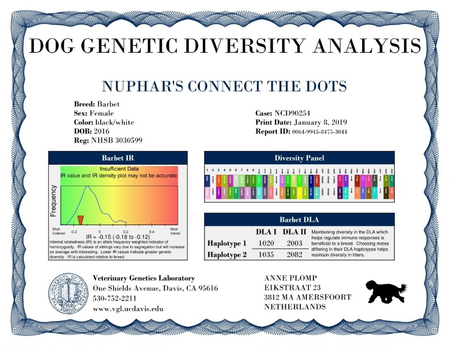 We zijn tot nu toe heel tevreden met Cait’s ontwikkeling. Ze heeft een mooie, kleine maat, maar veel massa en daardoor een flink gewicht, zoals de Barbet voor de inmenging van de Poedel en andere rassen/types ook had. In type is ze precies wat we hoopten te bereiken met deze combinatie. De komende tijd zal ons laten zien hoe Cait verder uitgroeit!