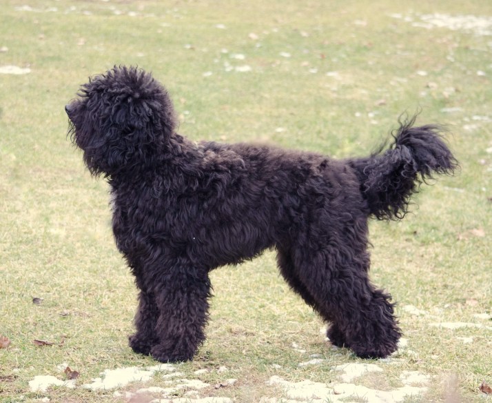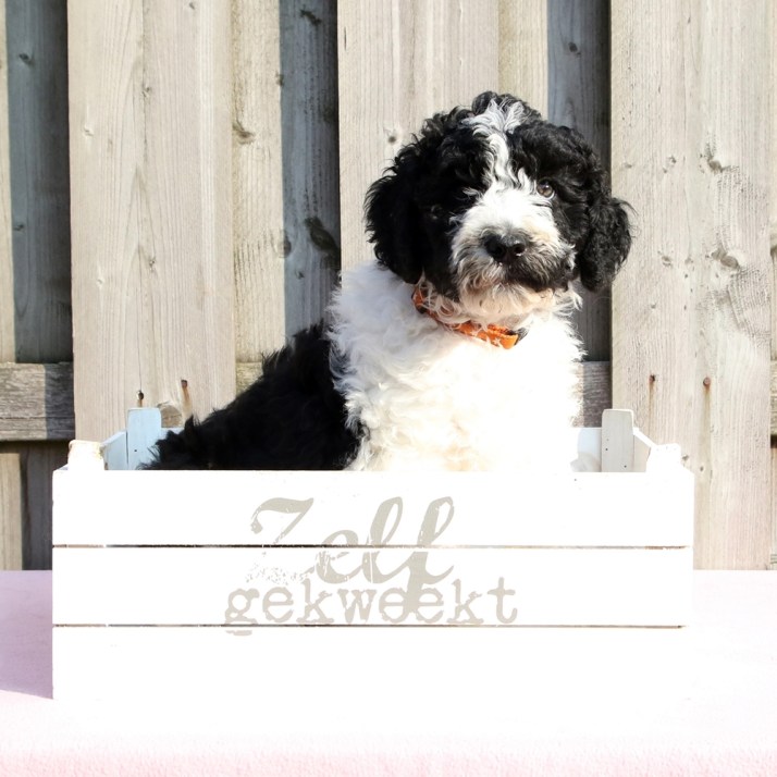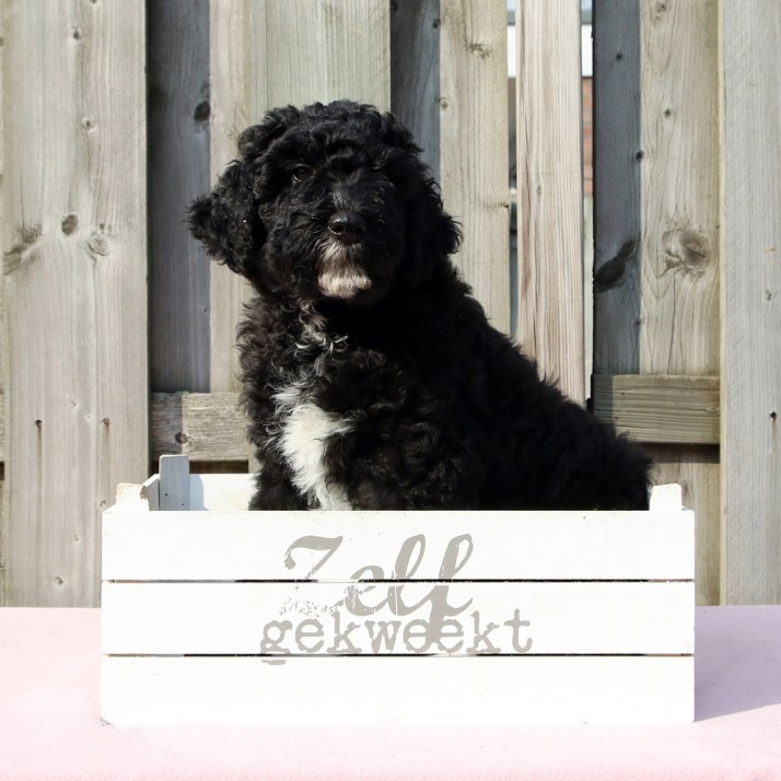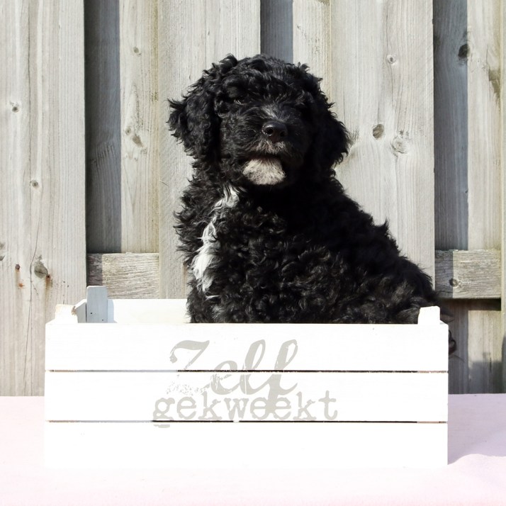 Hij is ongeveer 58 cm groot, krachtig gebouwd en heeft in zijn bouw de eigenschappen die wij graag willen behouden in onze lijn. Zijn type is dat waar wij zo van houden, met massa, een zeer correct front, goede ribbenkast, mooie lage hakken en een super gangwerk. Zijn losse zwarte krulvacht is rastypisch en voor zijn eigenaren goed te onderhouden.