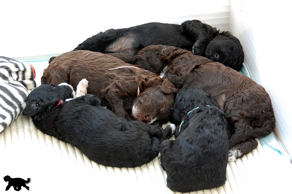 Dolce heeft redelijk haast gemaakt met bevallen, de pups kwamen vlot achter elkaar. Na nummer 6 heeft ze een kleine pauze gehouden voor de laatste 2. Ze is nu moe maar heel tevreden met haar 8 pups uit te rusten.
