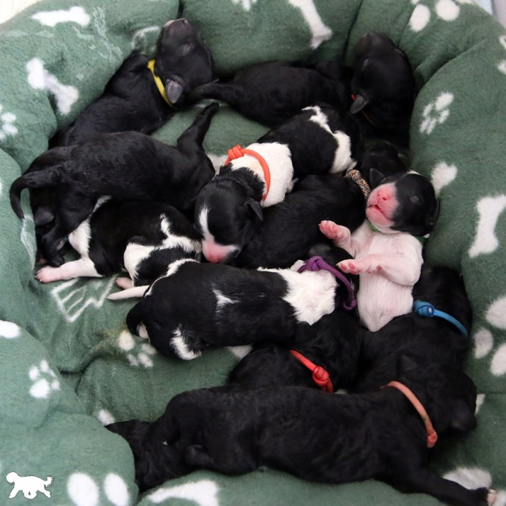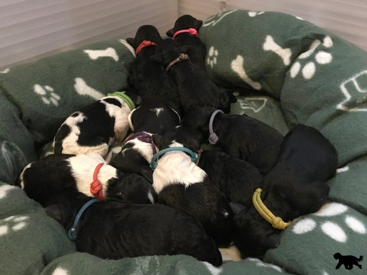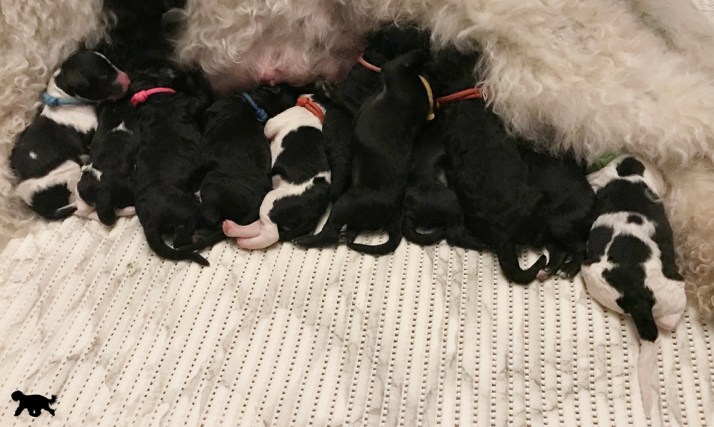 Cait ging direct aan het moederen, geweldig om te zien. In 10 uur tijd zijn er 11 pups geboren, hele vitale, levendige pupjes die geen stimulatie nodig hadden om op gang te komen.