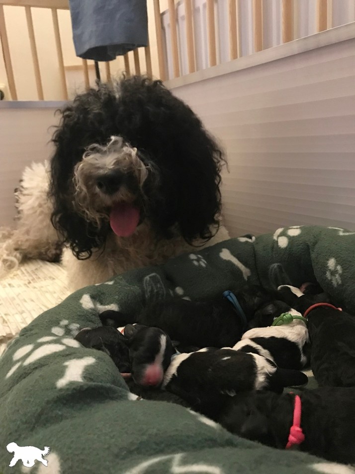 Wouter kwam gelukkig redelijk snel thuis en 10 minuutjes na zijn thuiskomst, was de eerste pup geboren.