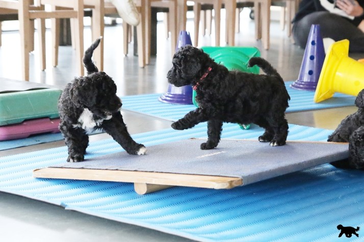Vandaag was de eerste les Super Start Sport Puppy (SSSP), een cursus van 4 lessen verdeeld over 4 maanden, gegeven door Sam Turner. In deze 1,5 uur durende lessen ligt de focus op balans en coördinatie, lichaamsbewustwording, zelfbeheersing en shapen.
