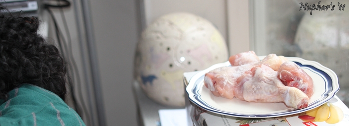 Een bordje met kippenpootjes wat staat te ontdooien. Dit keer voor óns avondeten ;-).