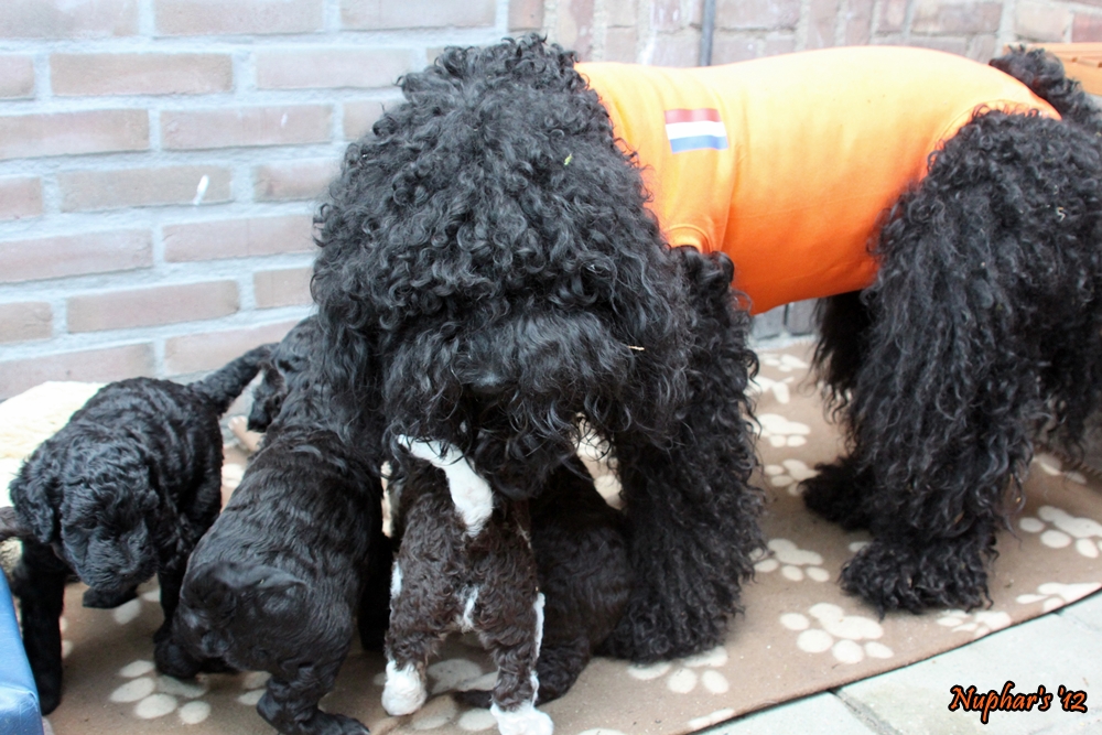 Omdat Alba ook wel eens bij de pups wil zijn zónder als melkbar te moeten dienen, heeft ze van ons een Medical Petshirt gekregen waardoor de pups niet bij haar tepels kunnen. Voor Alba duidelijk heel fijn, want haar eigen oplossing is weglopen en dat is zowel voor haar als de pupjes niet leuk! Ze kunnen heel veel leren van Alba en Alba vind het heerlijk om bij haar pups te zijn.