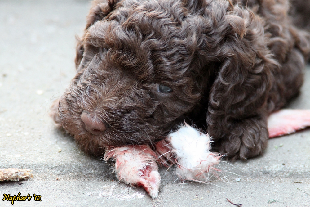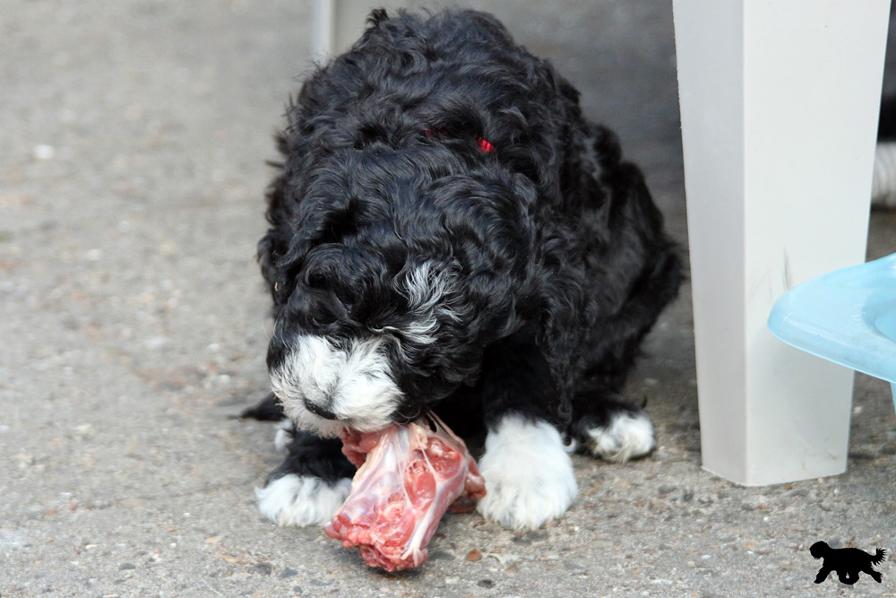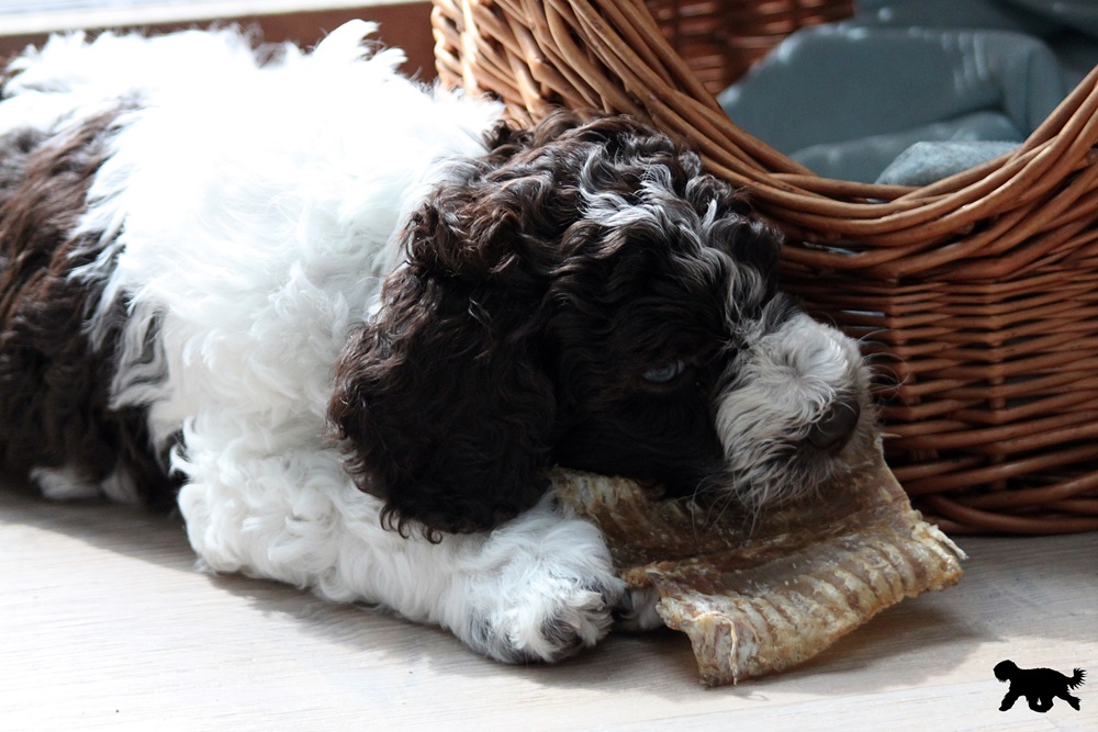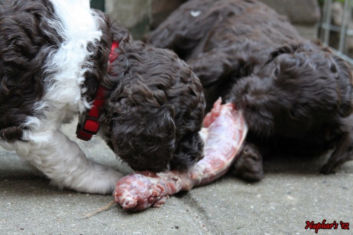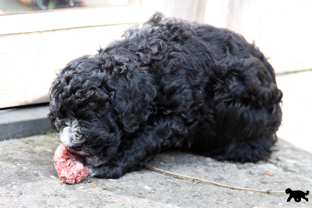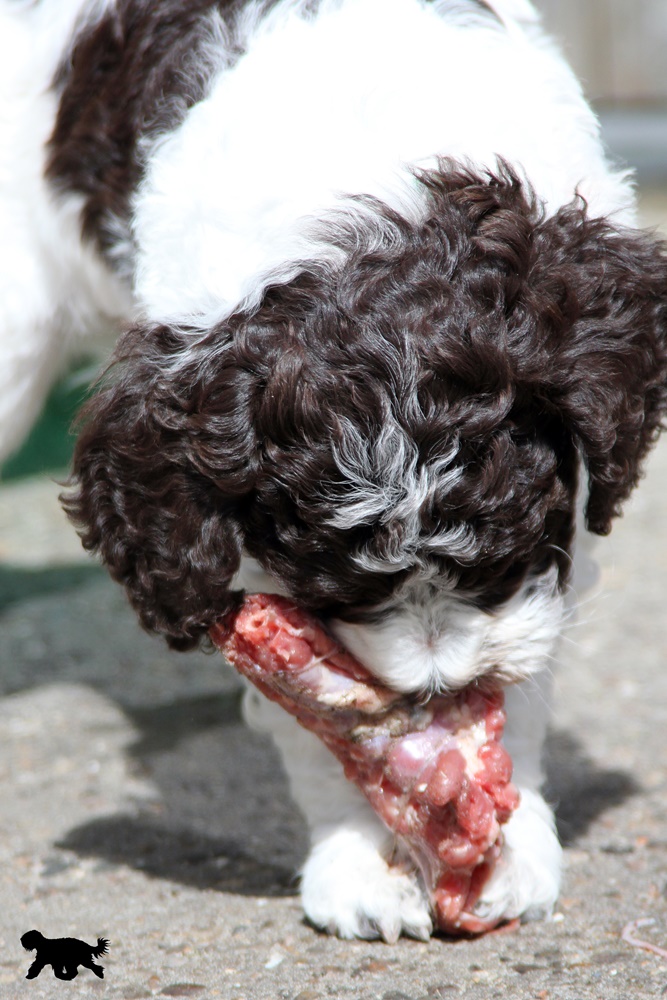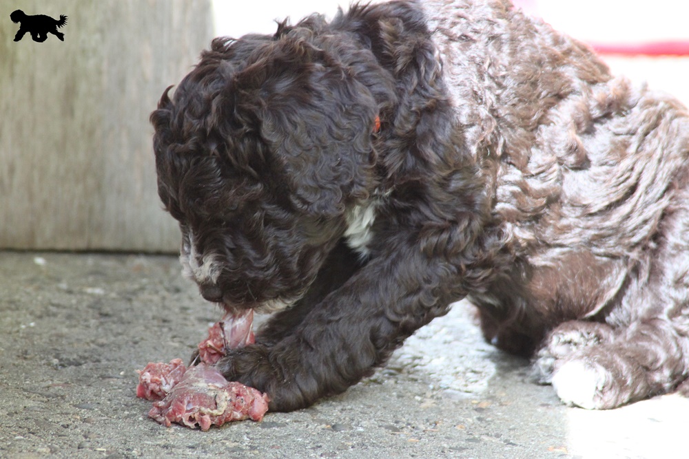 Naast het vleesmenu krijgen de pups ook regelmatig wat extra’s om lekker op te kluiven. Niet voor de gevoelige kijkers, maar dat hoort erbij als je een carnivoor in huis haalt, hieronder Donkerblauw met een rauw konijnenoortje.