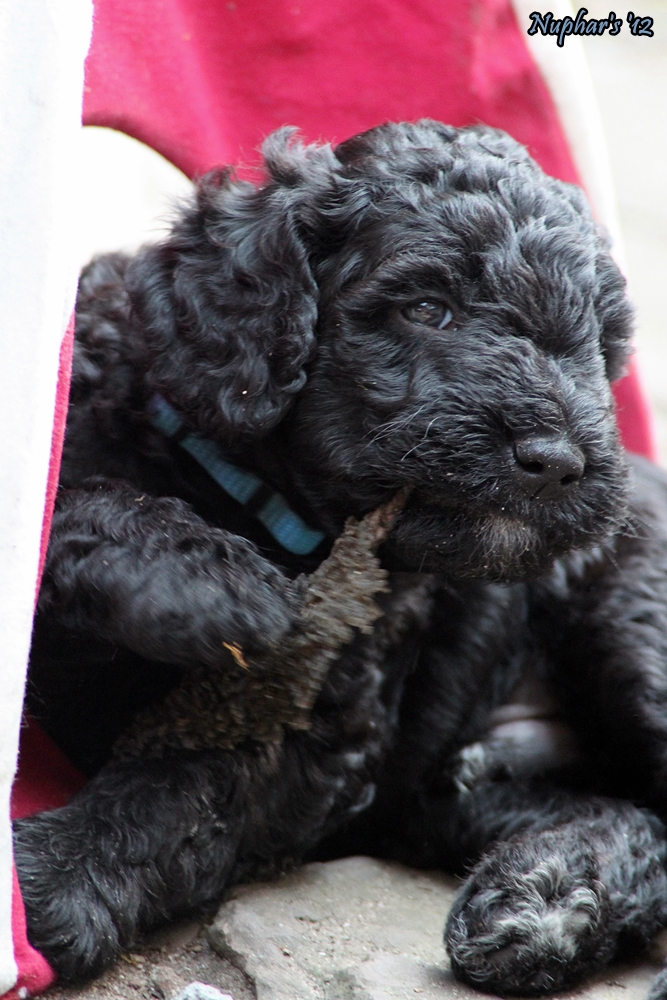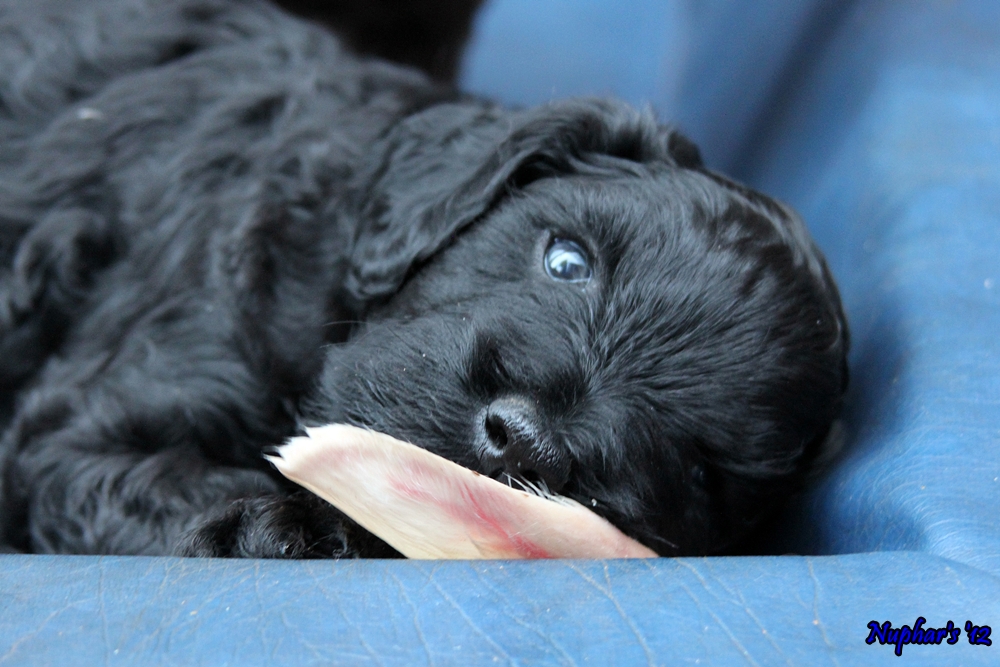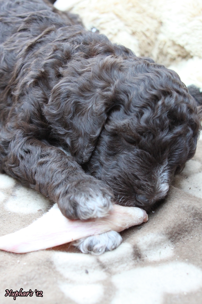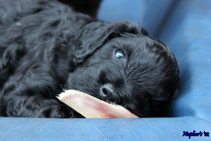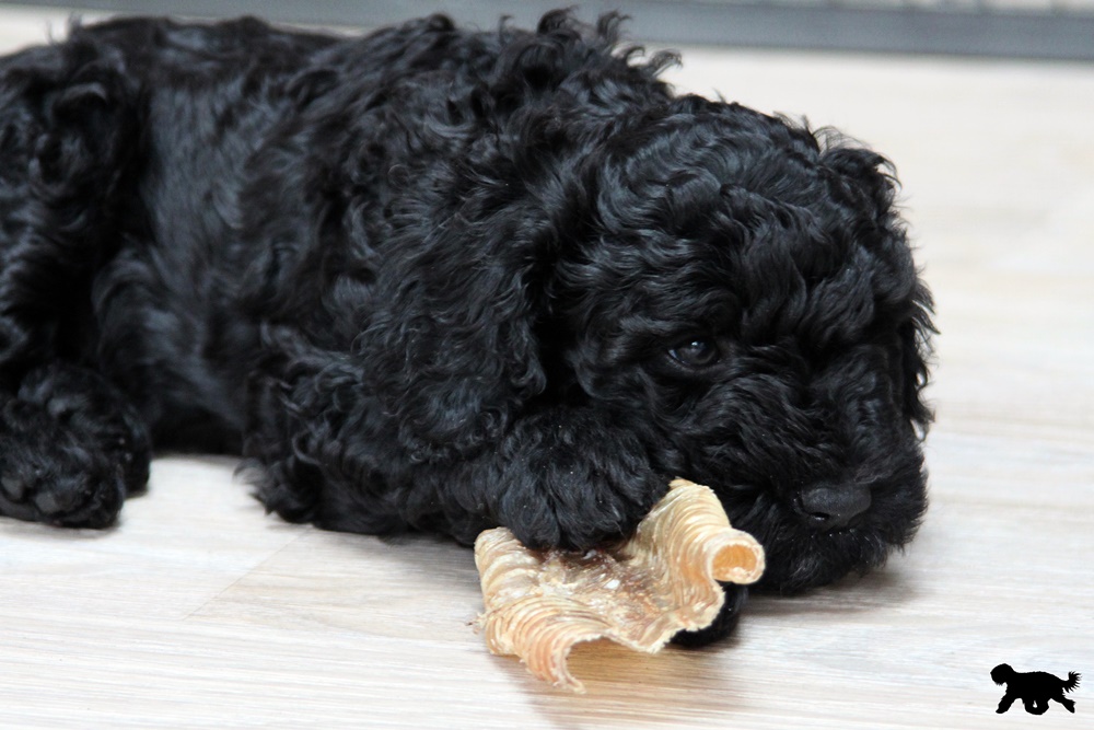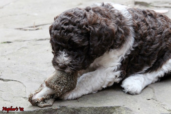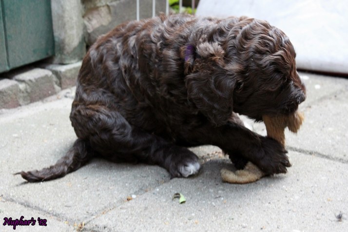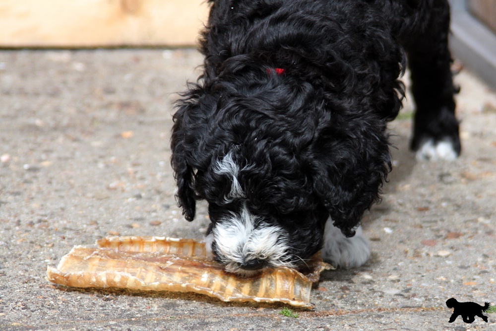 Naast het vleesmenu krijgen de pups ook regelmatig wat extra’s om lekker op te kluiven. Niet voor de gevoelige kijkers, maar dat hoort erbij als je een carnivoor in huis haalt, hieronder Donkerblauw met een rauw konijnenoortje.