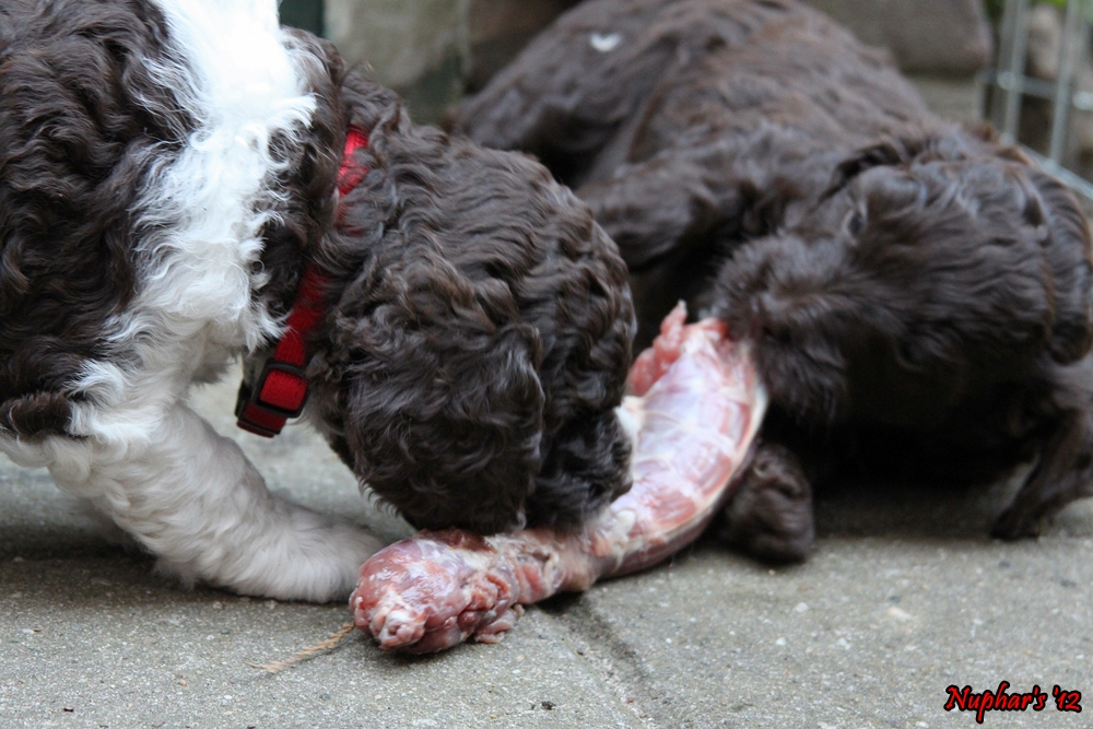 De pups genieten van stukken kipkarkas (niet alleen met Pasen!):