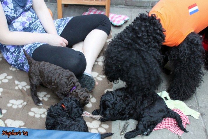 Na een paar dagen kleine balletjes vlees te hebben gegeten, was het afgelopen zondag tijd voor het ‘echte’ werk: eten uit een bakje. Niet veel, mama’s melk is nog altijd de hoofdmoot, maar de pups waren wel toe aan een beetje vast voedsel erbij. De balletjes vlees werden met veel enthousiasme en gesmak weggewerkt dus eens kijken of eten uit een eigen bakje ook ging.