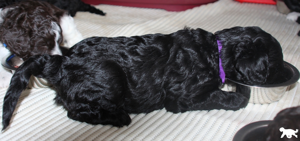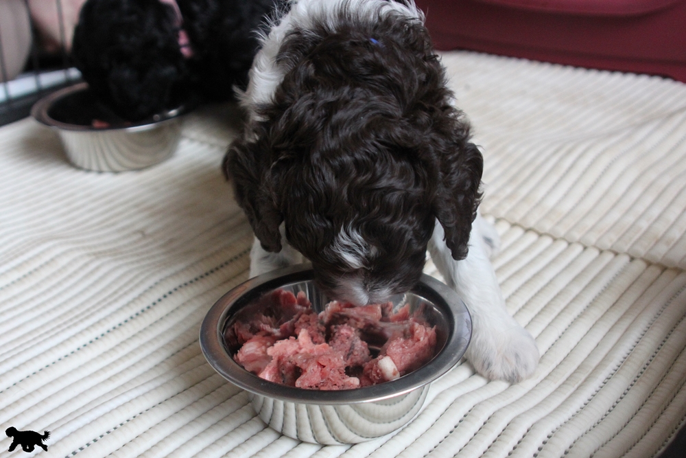 De pups krijgen inmiddels al het eten wat ze nodig hebben van ons, in de vorm van gemalen voer (KVV, ofwel Kompleet Vers Vlees van verschillende merken maar ook zelfgemalen vlees en pens). Alba voedt nog regelmatig wat, maar dat zijn de extraatjes.